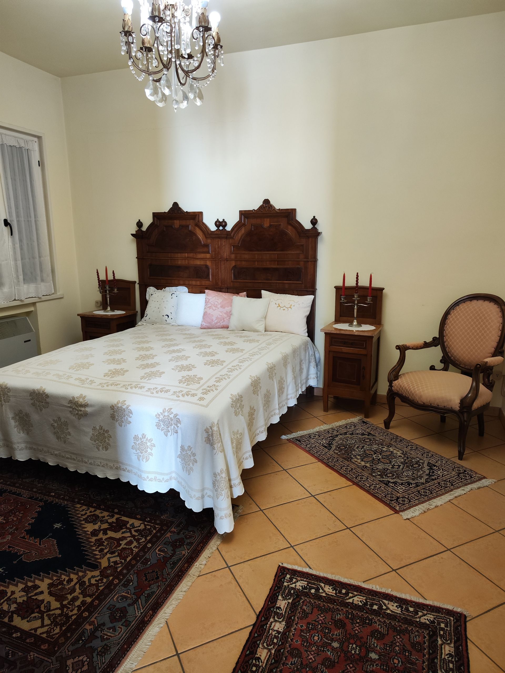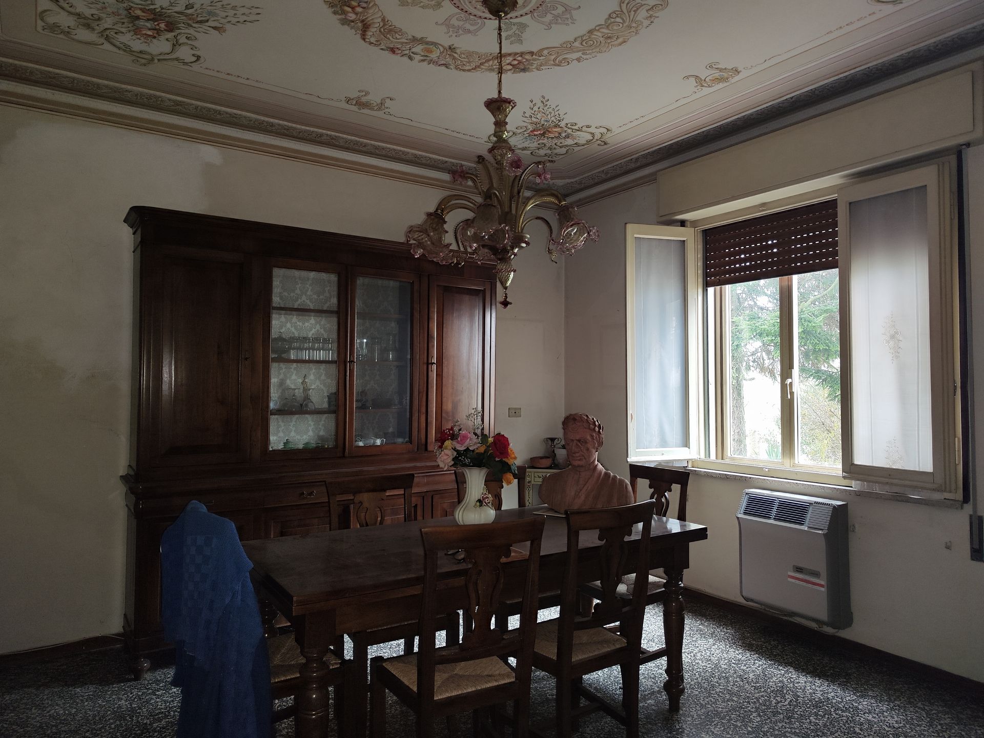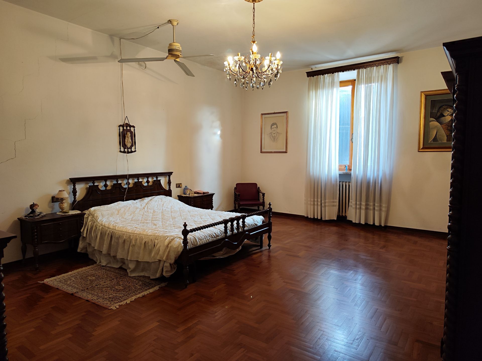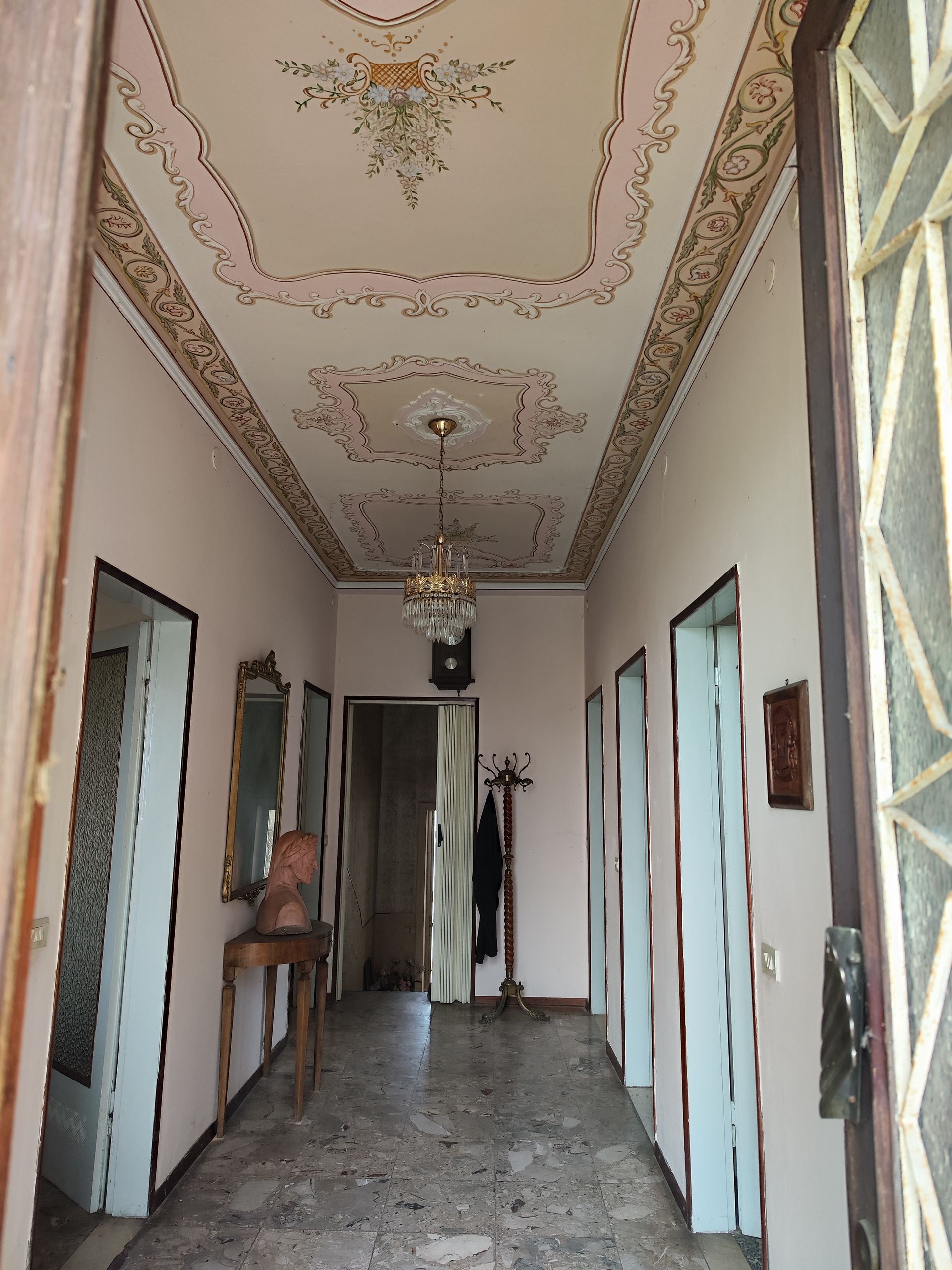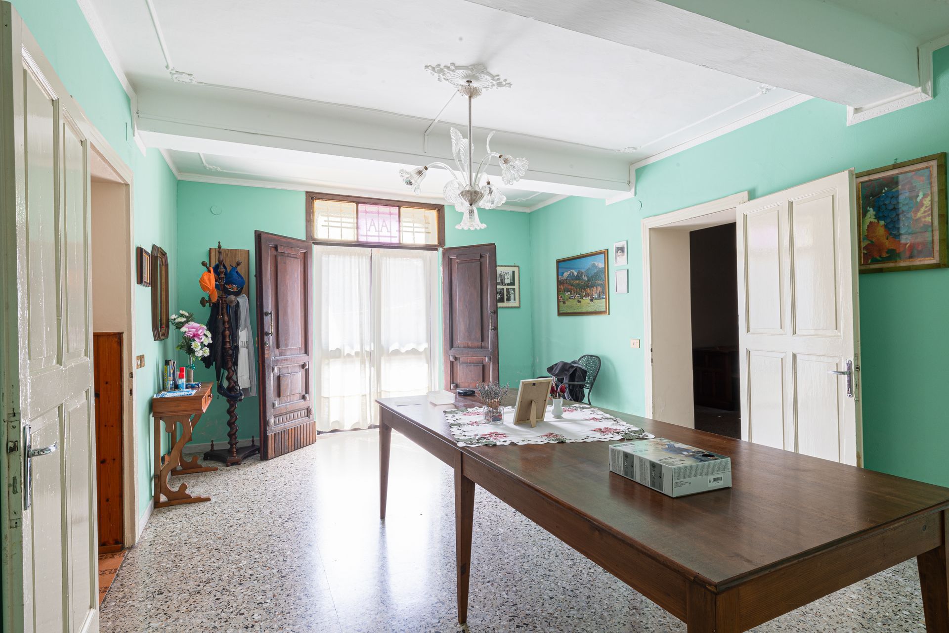 Questo immobile è costituito da due appartamenti, indipendenti fra loro, con annessi locali ad uso autorimessa. Il primo appartamento, sito al piano rialzato, comprende il corridoio d'ingresso, cucina abitabile, soggiorno, due camere da letto matrimoniali, un bagno e, tramite una scala interna, si accede al piano seminterrato adibito interamente a servizi (ripostiglio, cantina, locale sgombero.. . ). Le camere di questo appartamento presentano i soffitti affrescati.