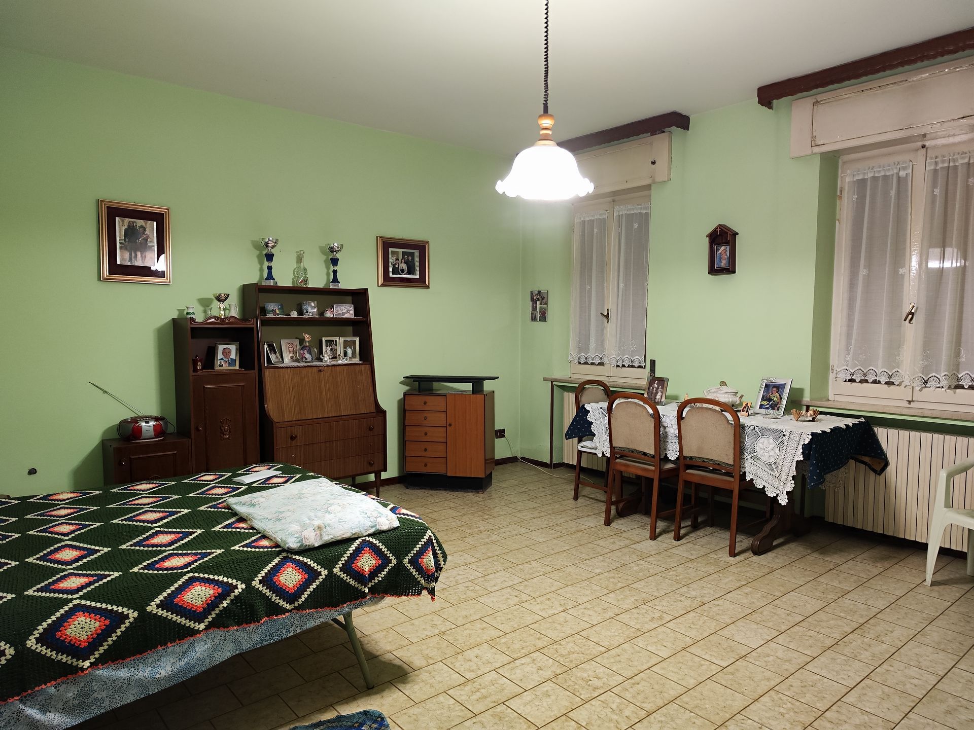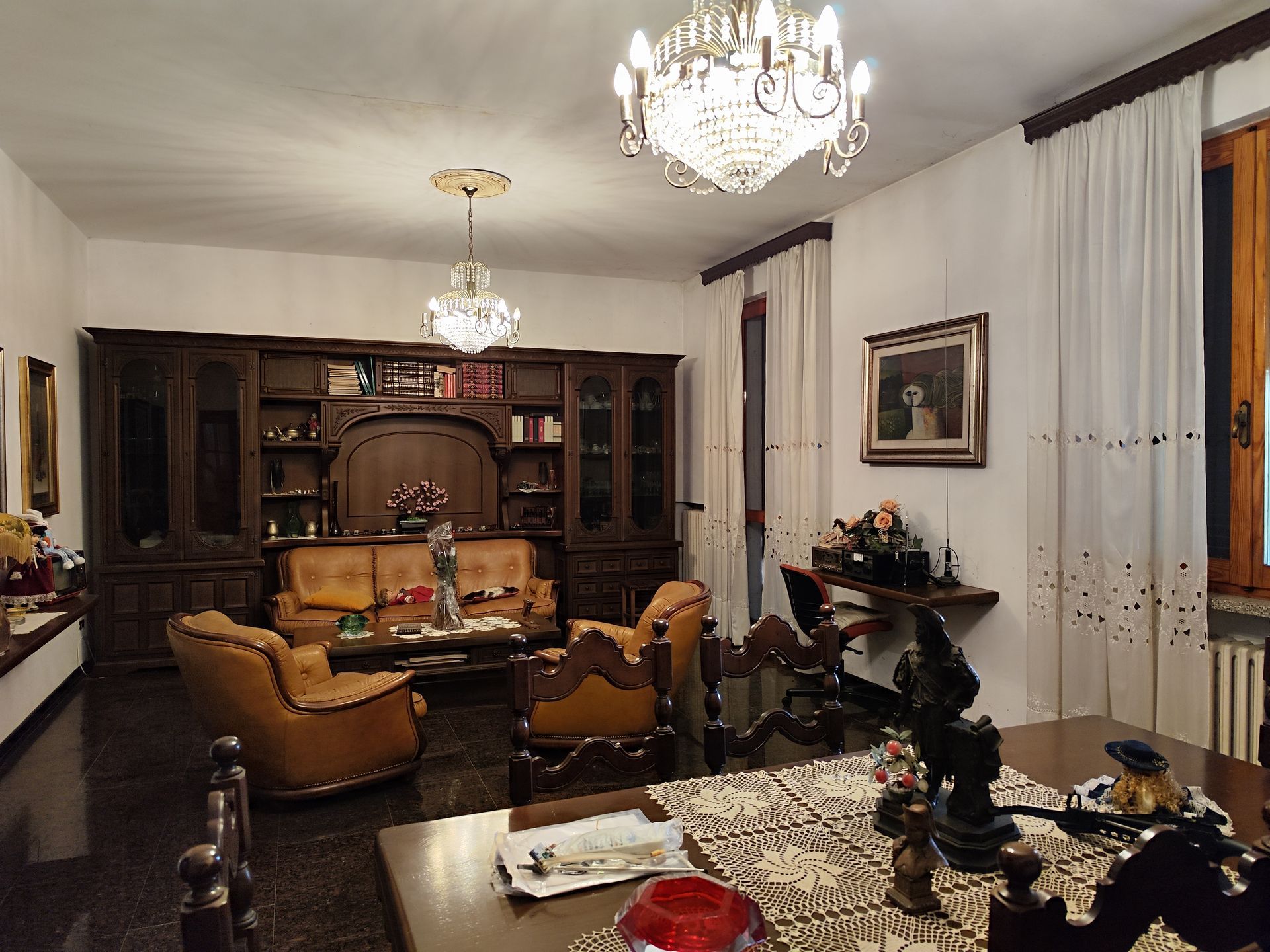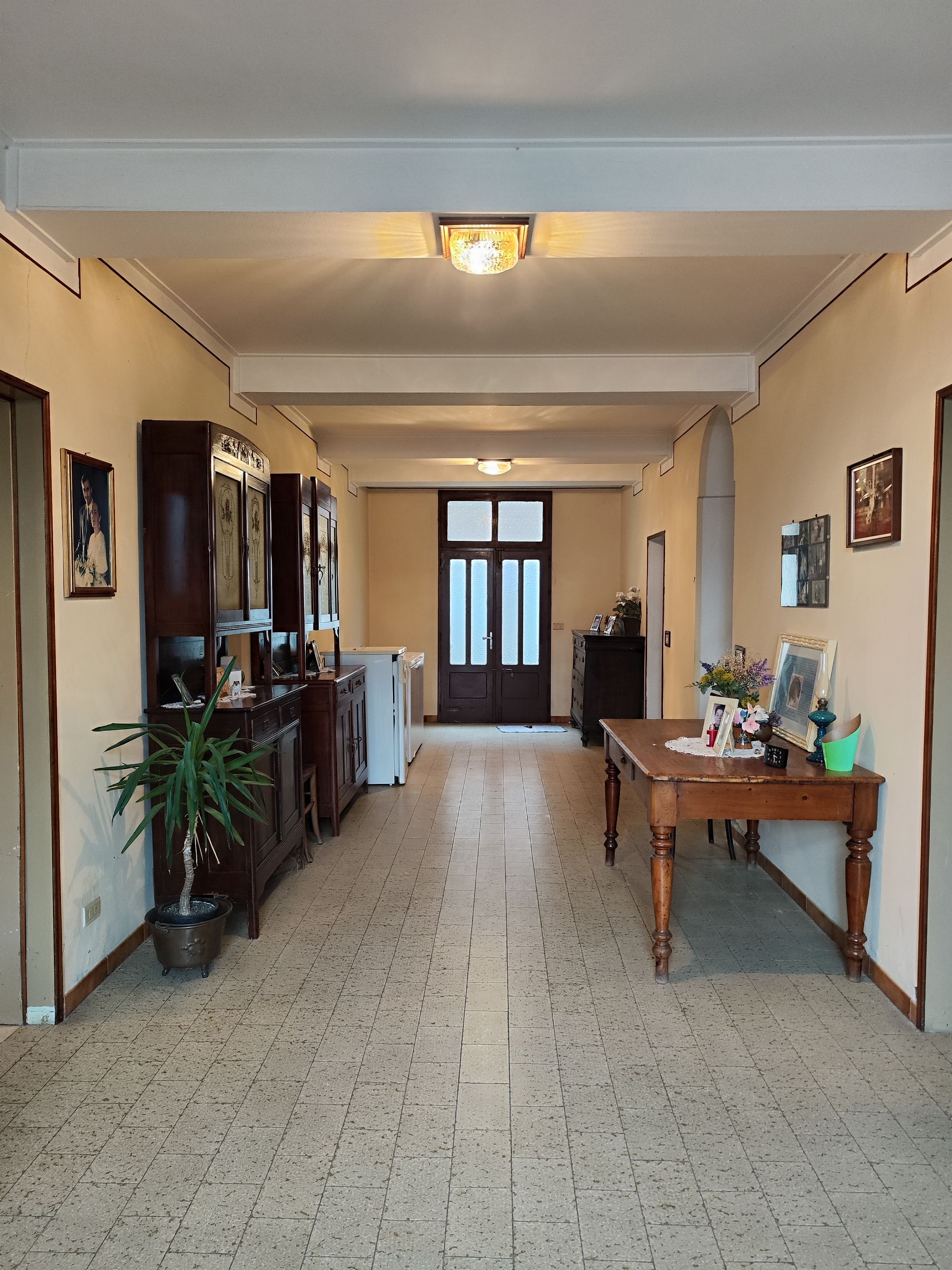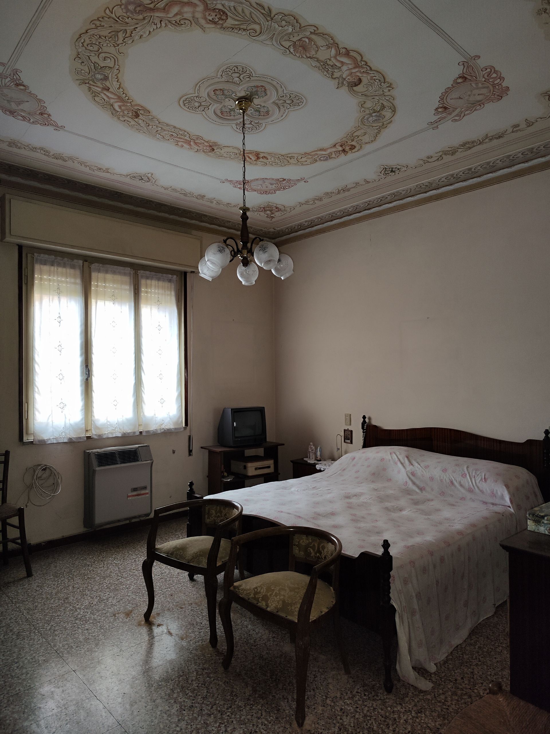 Questo immobile è costituito da due appartamenti, indipendenti fra loro, con annessi locali ad uso autorimessa. Il primo appartamento, sito al piano rialzato, comprende il corridoio d'ingresso, cucina abitabile, soggiorno, due camere da letto matrimoniali, un bagno e, tramite una scala interna, si accede al piano seminterrato adibito interamente a servizi (ripostiglio, cantina, locale sgombero.. . ). Le camere di questo appartamento presentano i soffitti affrescati.